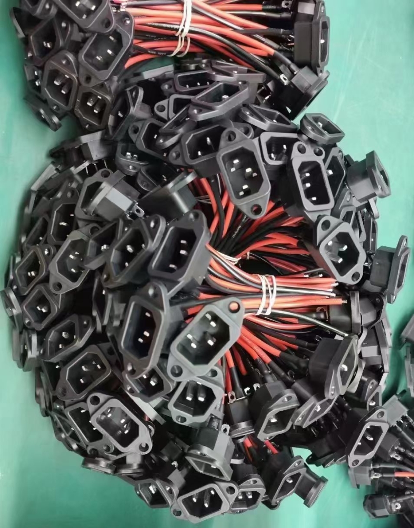 This IEC C14 panel mount power inlet features a standard 3-pin male connector with pre-attached red and black wire leads for easy installation. Designed for secure chassis mounting, it includes integrated screw holes for stable and reliable fastening to equipment panels.